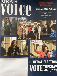 The “Election 2022 Pullout” lists what the magazine calls “Champions for Education,” MEA recommended candidates, and an absent voter ballot application.