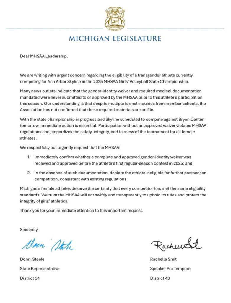 ANN ARBOR, Mich. (Michigan News Source) – State Rep. Donni Steele (R-Orion Township), along with her Republican female colleagues, asked the Michigan High School Athletic Association (MHSAA) on Tuesday to immediately verify whether a transgender student playing on a girls volleyball team has the required waiver approved to be eligible to play or remove the boy from the state tournament.