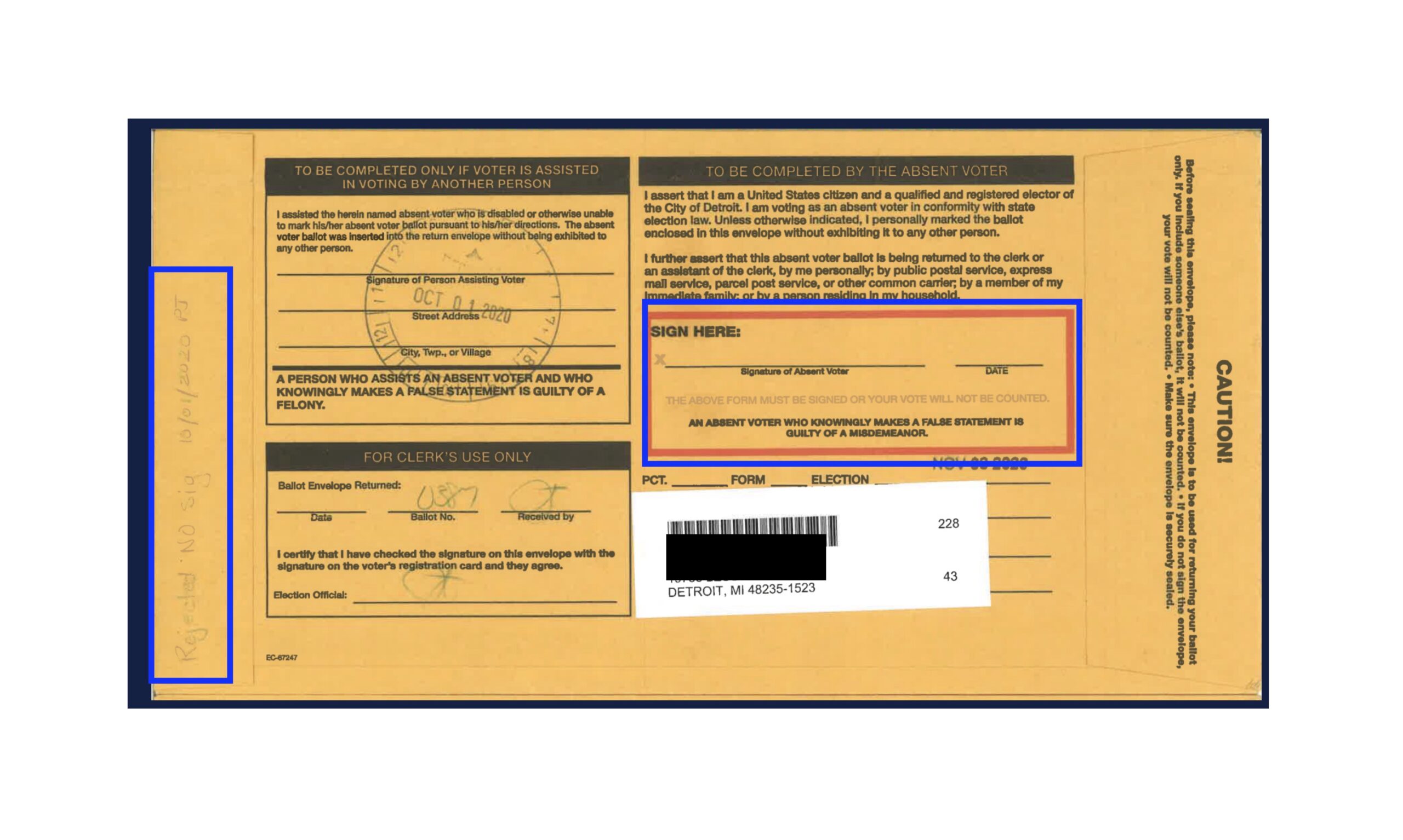 So far, their review has flagged multiple absentee ballot envelopes with issues that Gateway Pundit says should have prevented processing. Examples include ballots tied to nonexistent Detroit addresses, questionable timestamps, and instances where handwritten dates on envelopes post-date the official received timestamp.